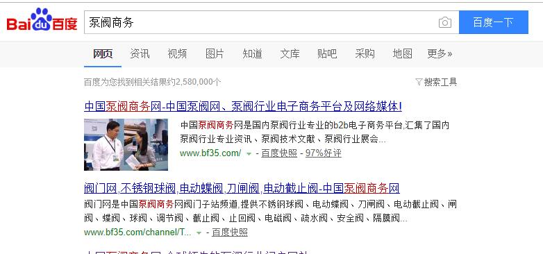 泵閥商務網與Baidu、360、sogo、google、soso等搜索引擎強強聯合,不僅為泵閥企業提供行業門戶平臺宣傳推廣,同時也為泵閥企業爭取搜索引擎增值服務,提供Baidu、360、sogo、Google、soso等優化推廣服務!壟斷多個搜索頁面,沖擊采購者眼球!